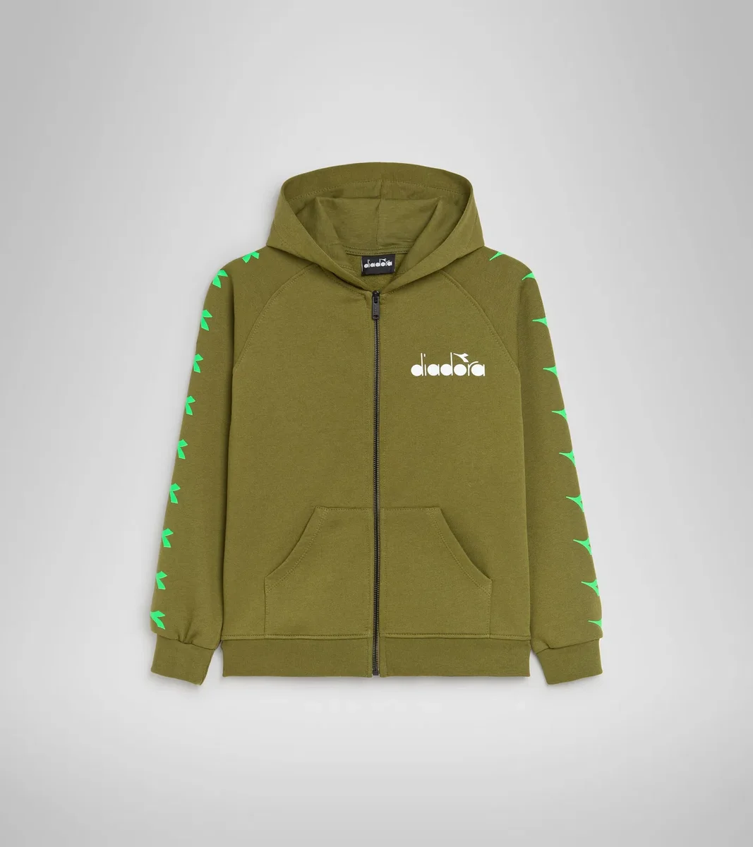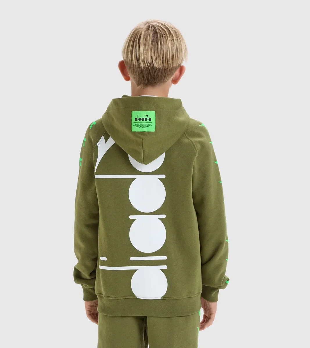 Felpa sportiva monocromatica con maxi logo stampato sul retro e motivo fregio su tutte le maniche. La toppa verde acido sul cappuccio racchiude tutta la personalità di questo capo. Un capo minimal che non rinuncia a un po’ di protagonismo.