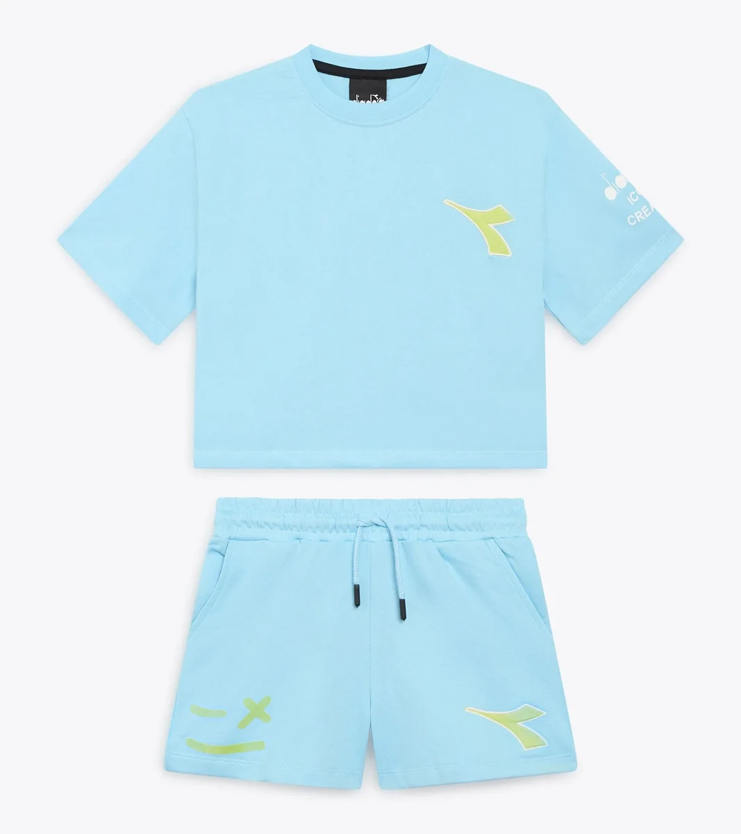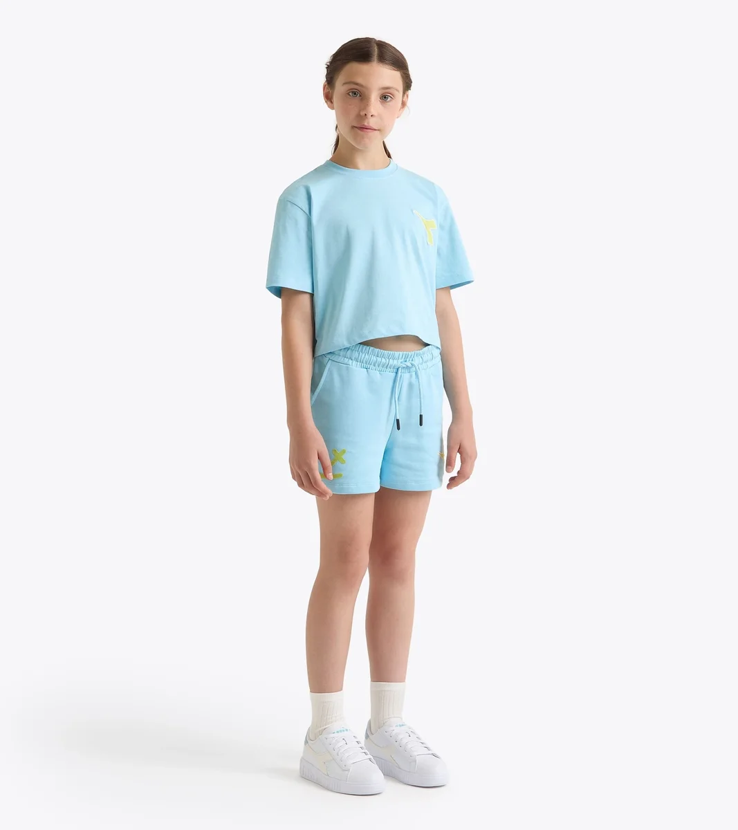 Un outfit casual da bambina composto da una maglietta corta e pantaloncini con elastico in vita. Un outfit versatile e leggero è ciò che ti serve per affrontare brevi viaggi o avventure con lo zaino in spalla!