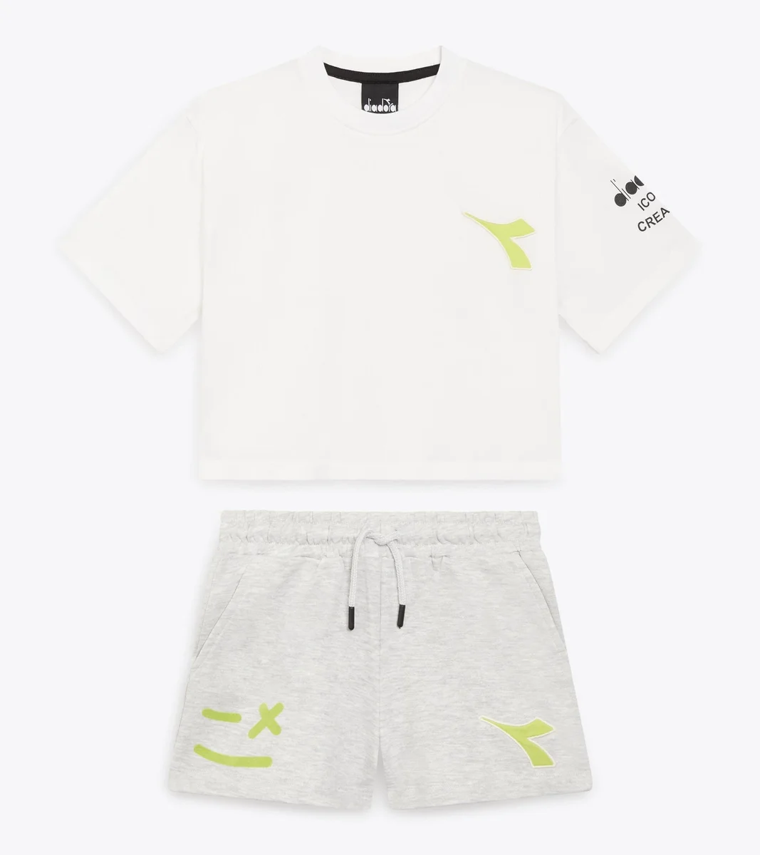 Un outfit casual da bambina composto da una maglietta corta e pantaloncini con elastico in vita. Un outfit versatile e leggero è ciò che ti serve per affrontare brevi viaggi o avventure con lo zaino in spalla!