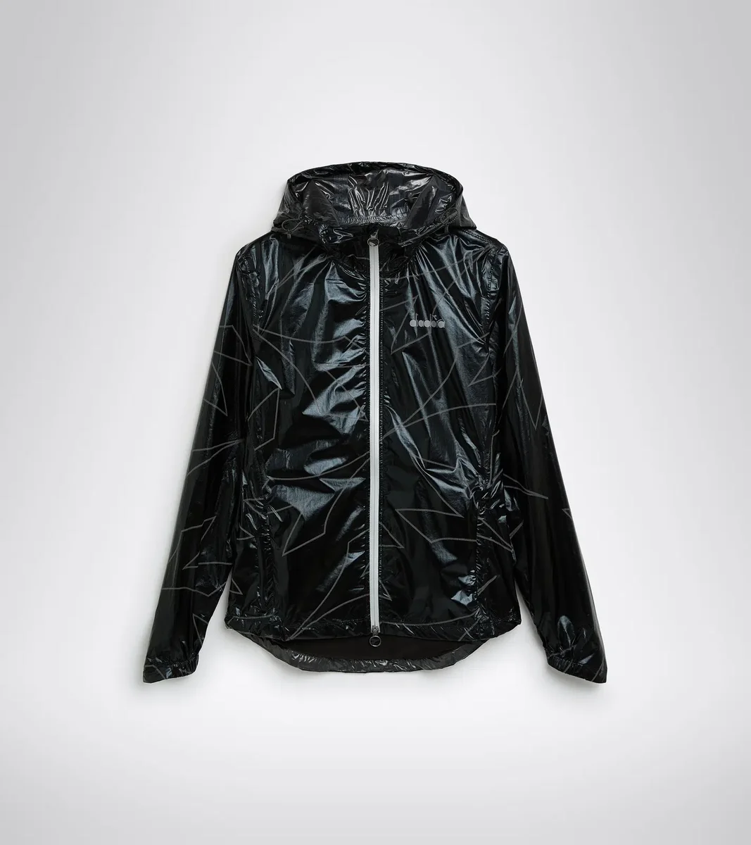 Giacca da corsa impermeabile da donna con cuciture completamente nastrate e stampa riflettente multi-fregio su tessuto a due strati. Cappuccio regolabile, zip impermeabile, polsini sagomati e apertura sul retro per aumentare la traspirabilità ad ogni passo durante la corsa.