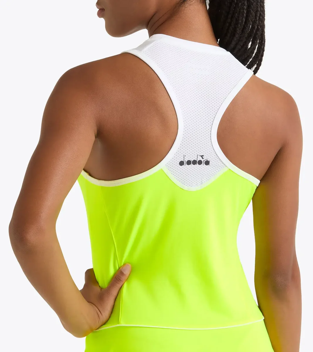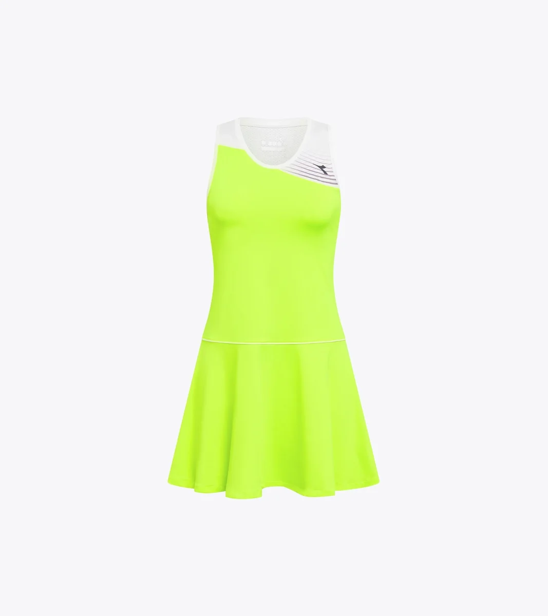 Abito canotta in morbido jersey di poliestere elasticizzato con inserto in rete sul retro, vita bassa e gonna svasata. Perfetto da indossare durante le partite e gli scambi più intensi.