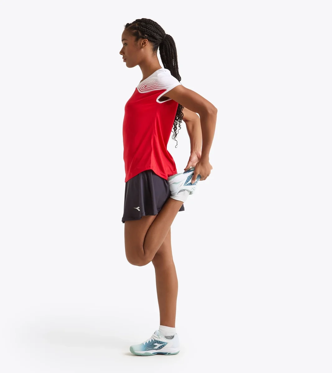 Gonna svasata in morbido jersey di poliestere elasticizzato, con vita alta e pratica tasca interna. Dai un tocco di stile ai tuoi allenamenti.