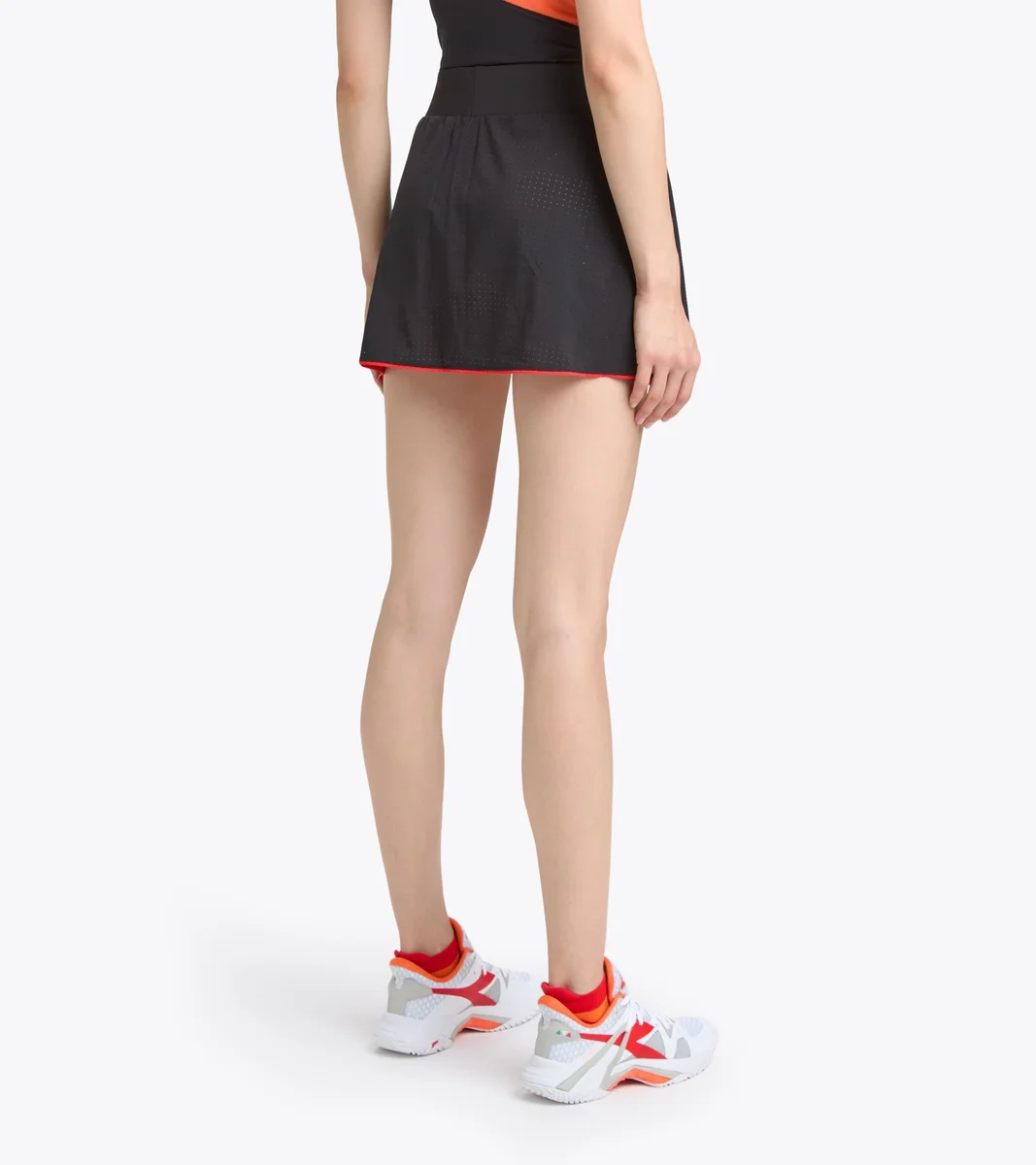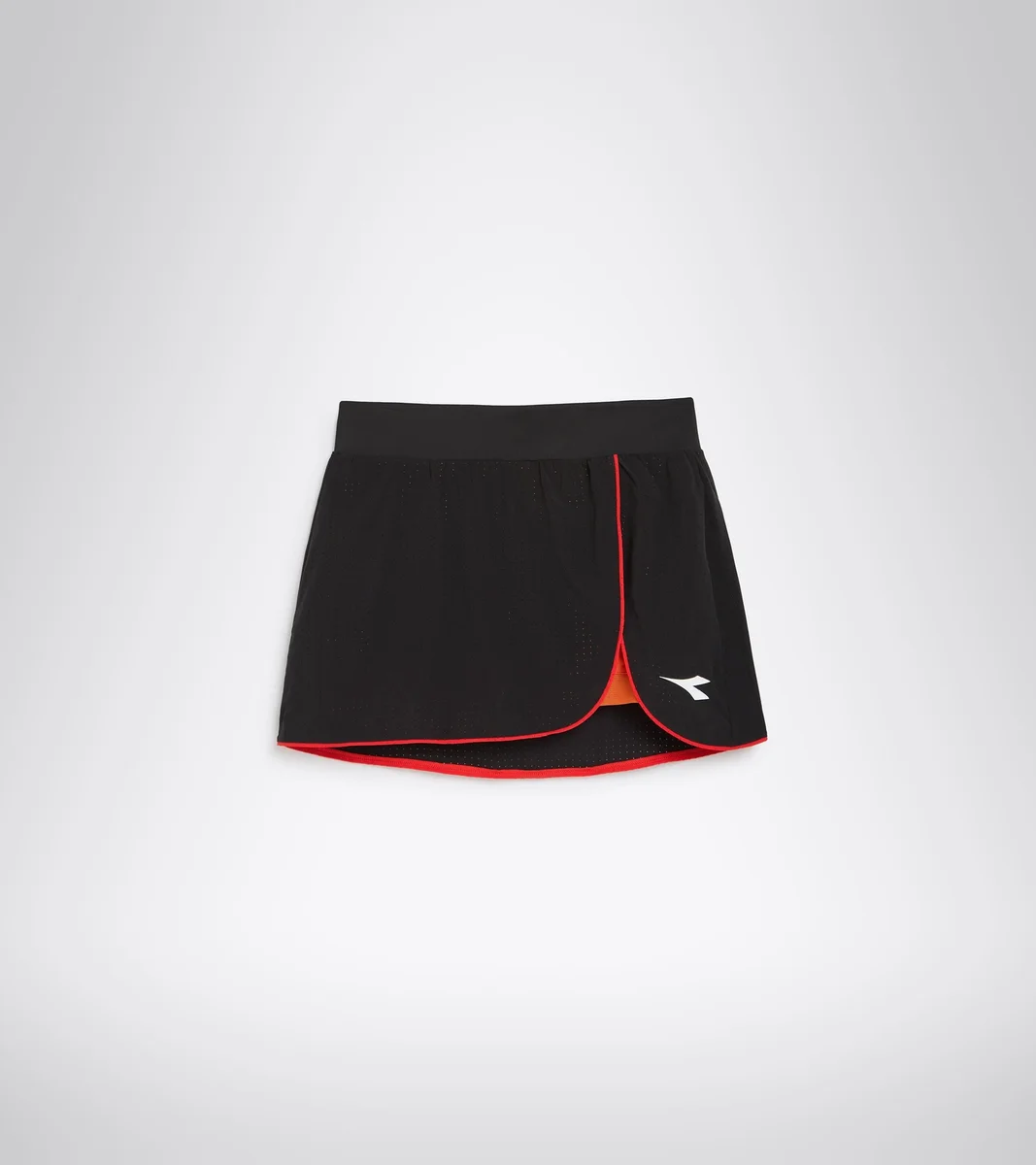 Gonna da tennis da donna in microfibra traforata con profondo spacco frontale e bordi a contrasto. I pantaloncini, con rete effetto tulle sul fondo, presentano tasche porta palline sui lati. Il marchio segue le regole dei tornei internazionali. Inoltre, il tessuto è dotato della tecnologia diadora dia dry e offre il massimo comfort durante l’attività sportiva, aiutando a mantenere il corpo asciutto e allontanando rapidamente l’umidità dalla pelle.