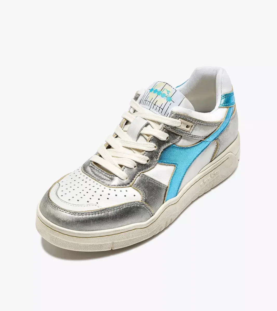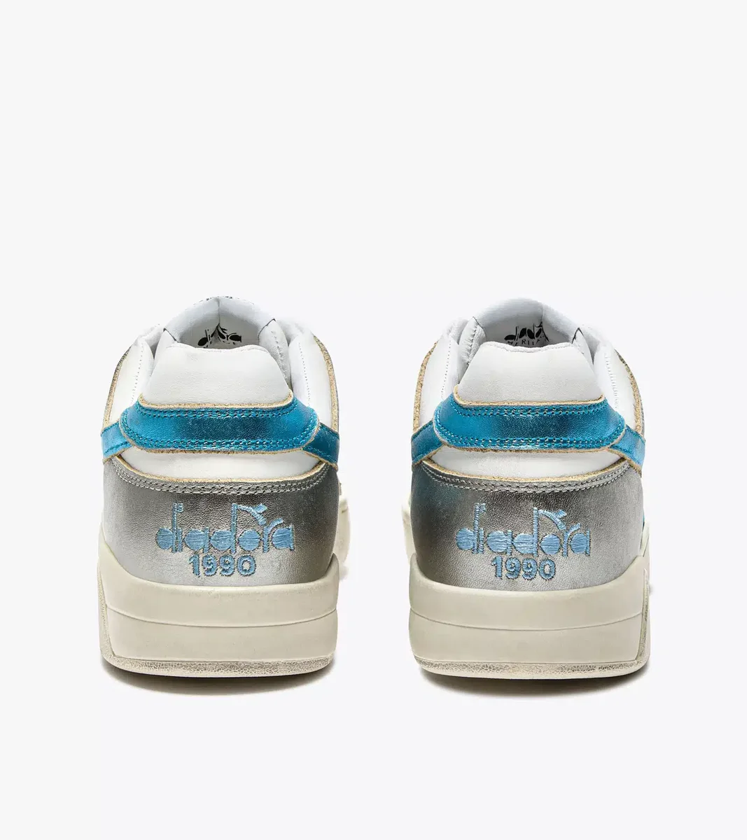 Dettaglio tipico delle sneakers Diadora Heritage, il trattamento stonewash ammorbidisce la pelle
