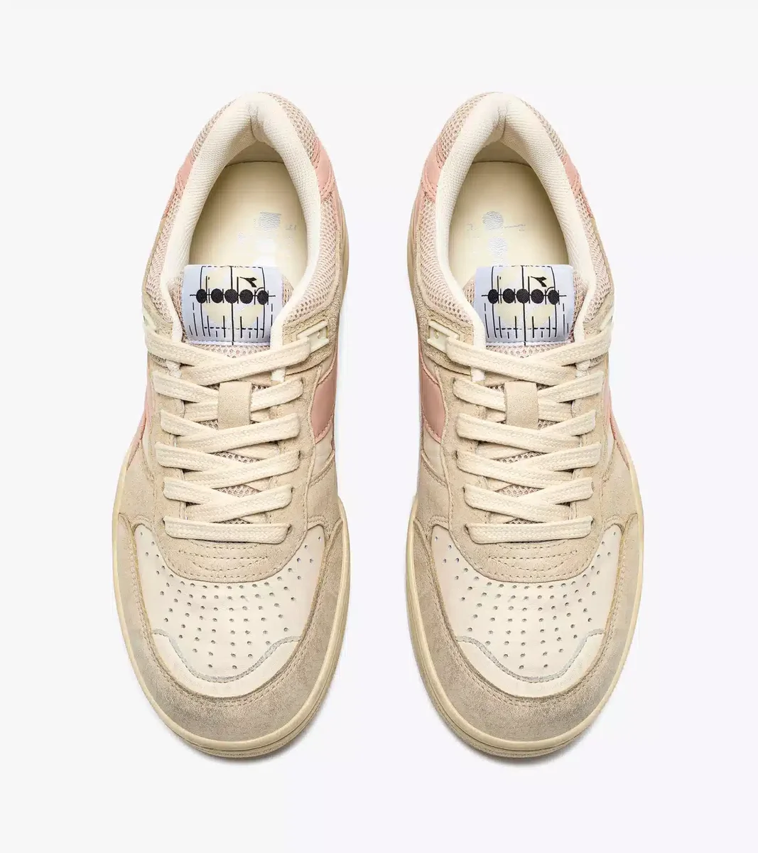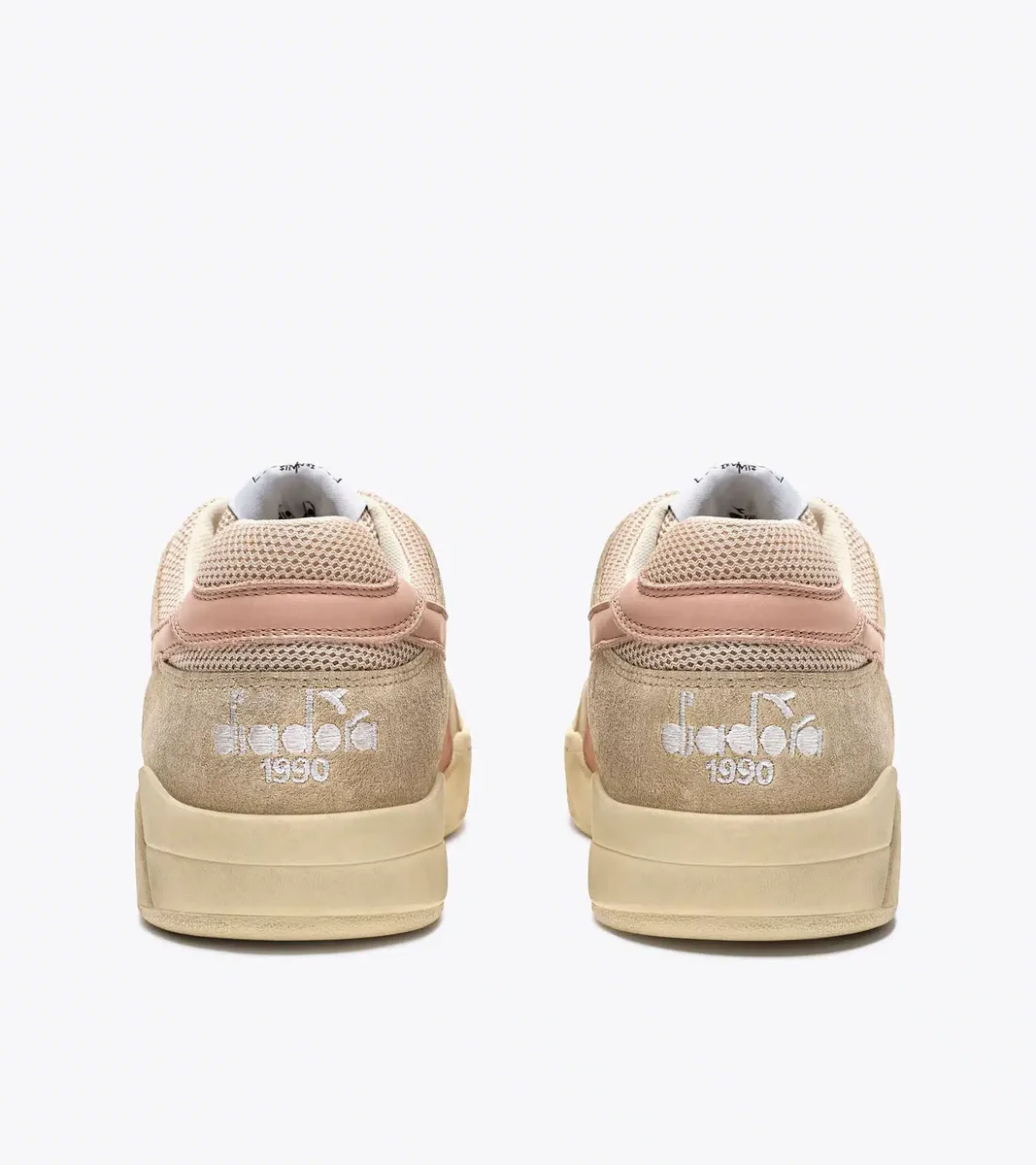 Dettaglio tipico delle sneakers Diadora Heritage, il trattamento stonewash ammorbidisce la pelle