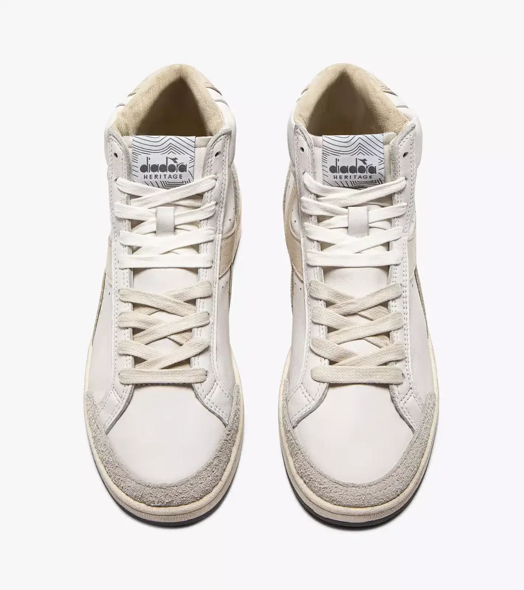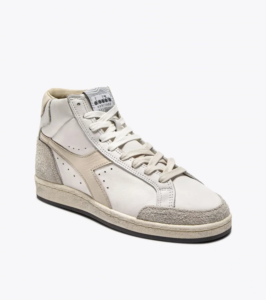 Prestige High Used è realizzata in pelle con dettagli in pelle scamosciata di vacchetta. Il trattamento stonewashed ammorbidisce i materiali, mentre una leggera finitura cerata conferisce alla scarpa il suo inconfondibile look vissuto, segno distintivo della linea Diadora Heritage.