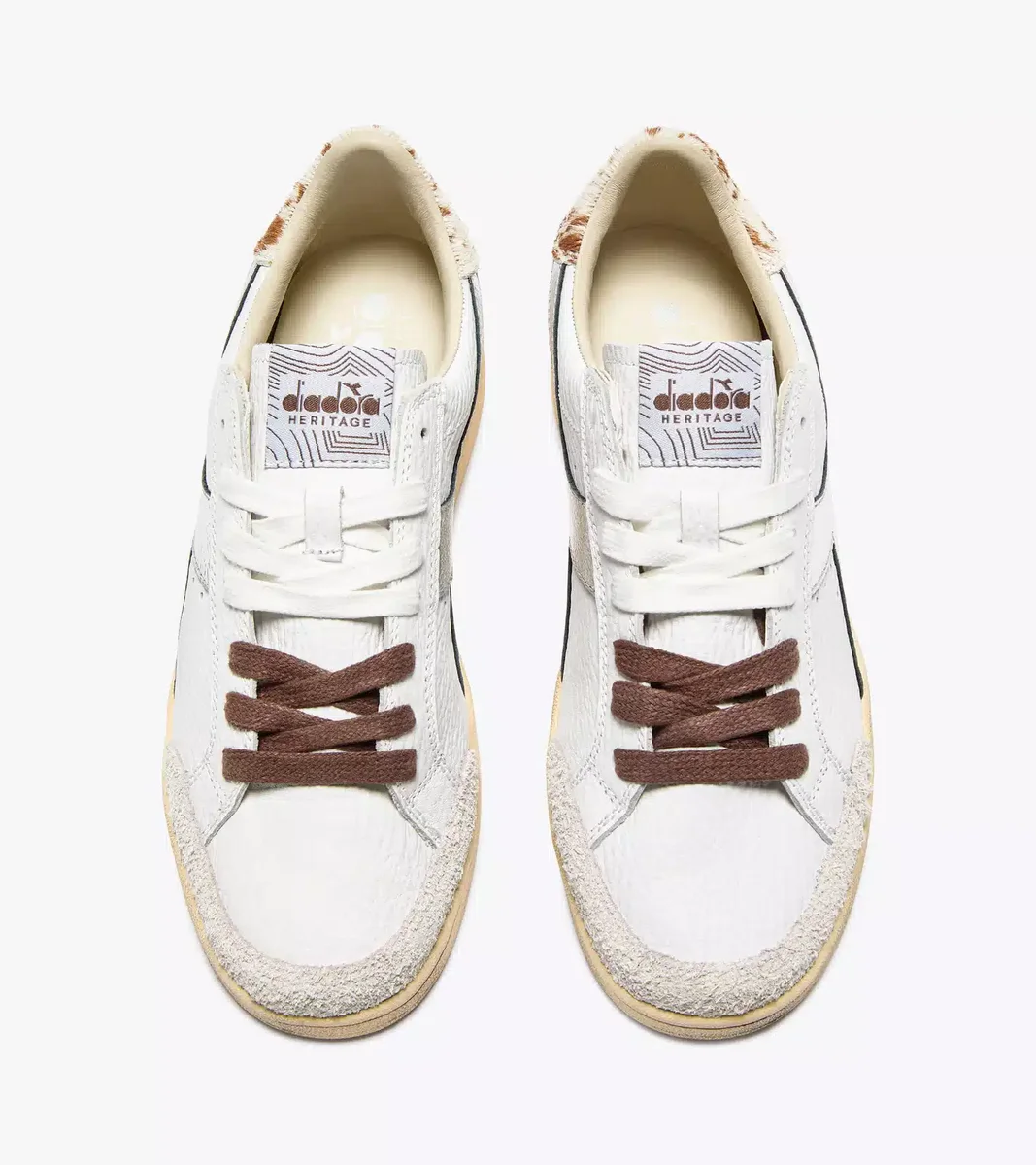 Prestige Safari WN si distingue per il tallone con dettagli animalier in pelle cavallino, in perfetto contrasto con il logo laminato lucido. Una leggera finitura cerata le conferisce quell’inconfondibile look vissuto, segno distintivo delle sneakers Heritage.