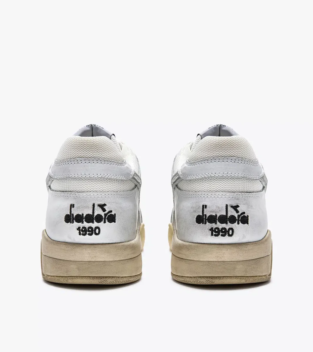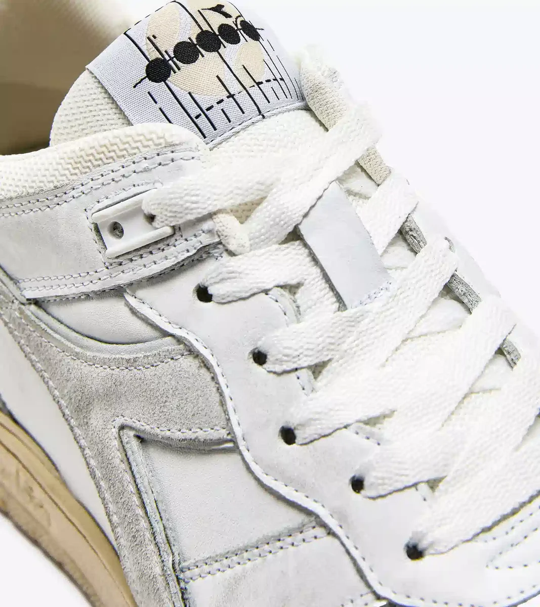 Dettaglio tipico delle sneakers Diadora Heritage, il trattamento stone wash ammorbidisce la pelle