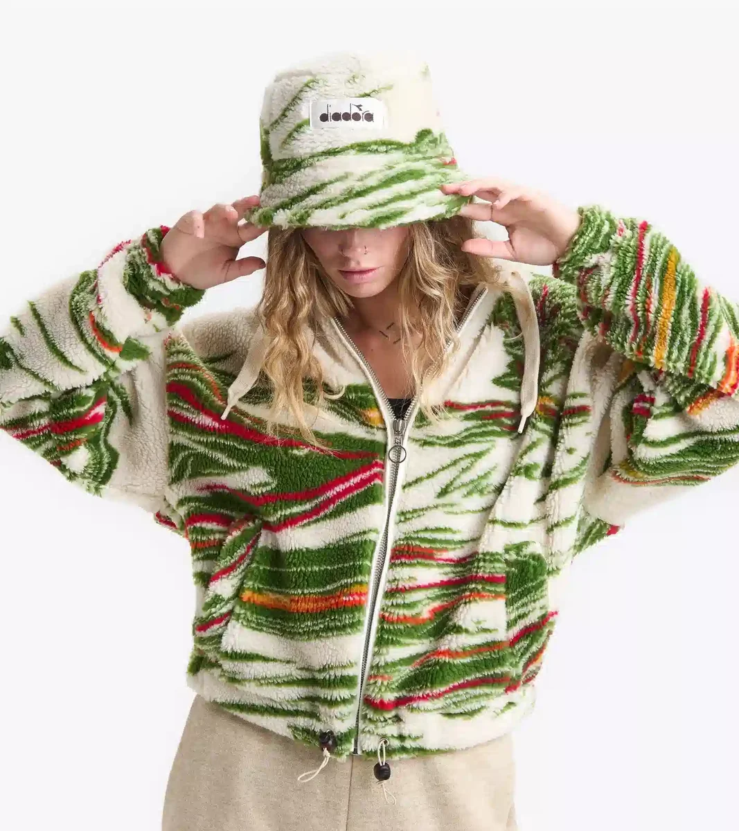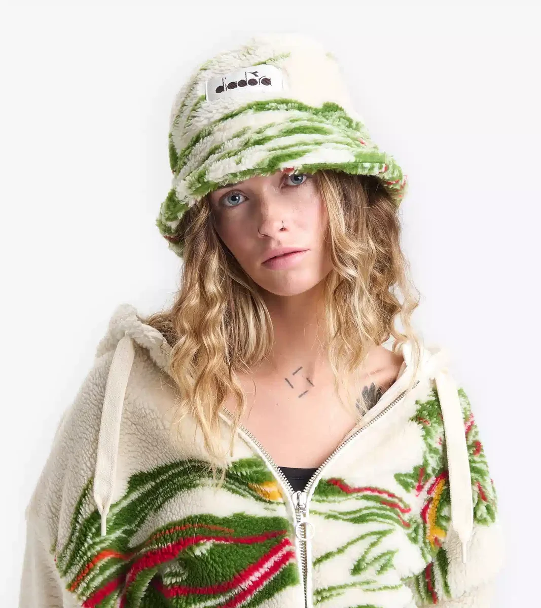 In collaborazione con la cantante italiana Madame, una delle artiste più influenti e apprezzate nel panorama musicale, abbiamo disegnato una capsule collection che rende omaggio alla natura e alle sue forme. La collezione è interamente realizzata in Italia con poliestere riciclato. Il cappello a secchiello è uno degli accessori più ricercati. Lo abbiamo disegnato in bianco, con un motivo ispirato alla natura. È così morbido che ti sembrerà di essere sdraiato in mezzo a una foresta. Abbinalo al pile coordinato e preparati per la tua prossima avventura!
